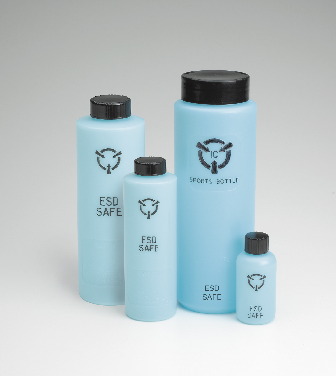 All of our Clean Room blue static dissipative solvent containers have an average surface resistivity of 10^9 to 10^10. Our blue bottles will dissipate a charge of plus or minus 5000 volts in less than 2 seconds at 40% relative humidity. By their chemical nature, they will not have any chemical reactivity with solvents such as TCE or alcohol. The pH of the deionized water solutions tested was the same before and after a 7-day period. No color change or any other physical change noted for any solvents tested. Competitively priced with existing Static Generating Containers & Bottles. Helps to meet ANSI/ESDA S20.20.